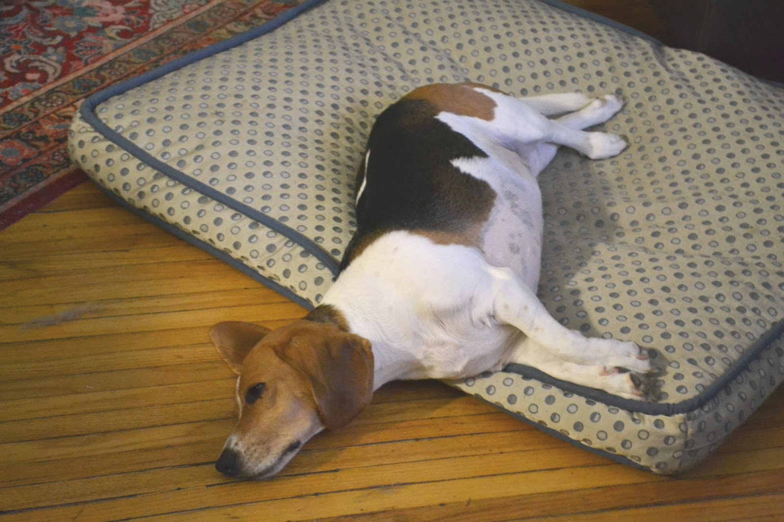 Lulu doesn't always sleep like this, but it is funny that she chose the hard floor to lay her head.