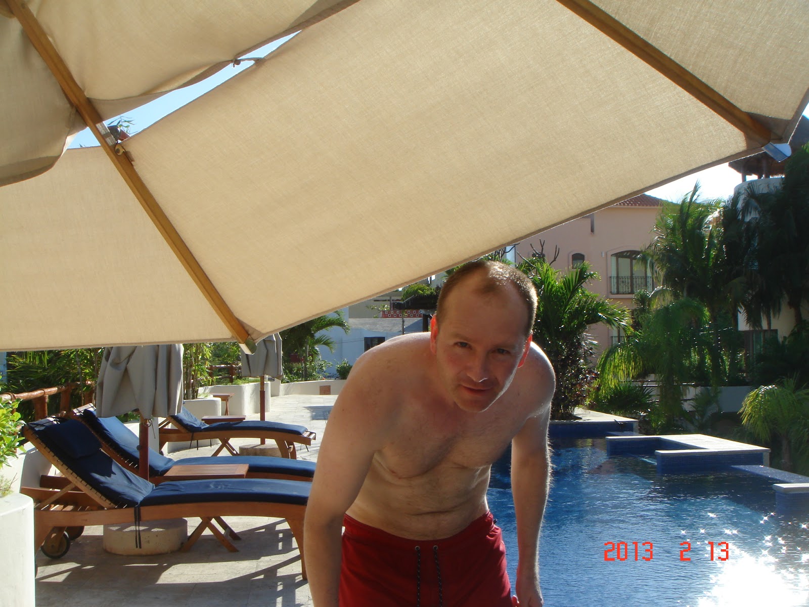 Steven waving from the heated pool.